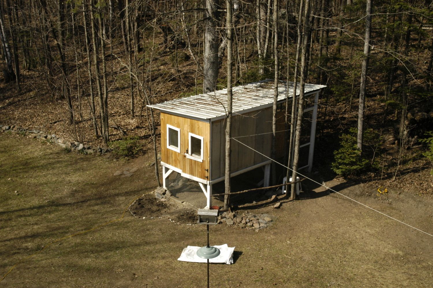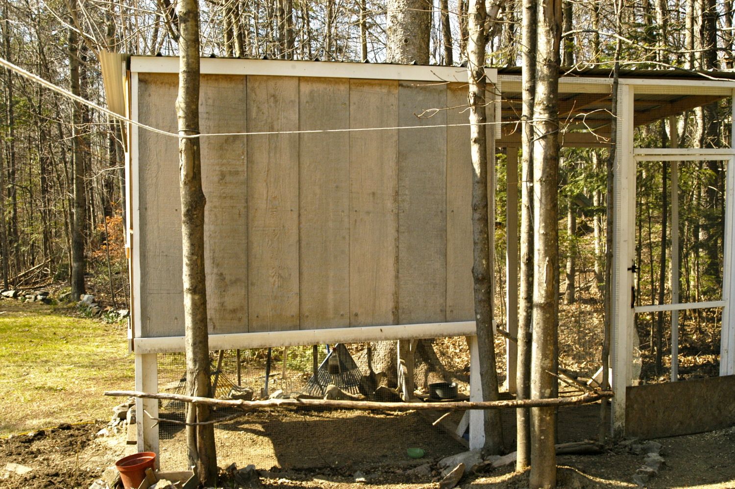 Outdoor perch and east facing side of the coop.