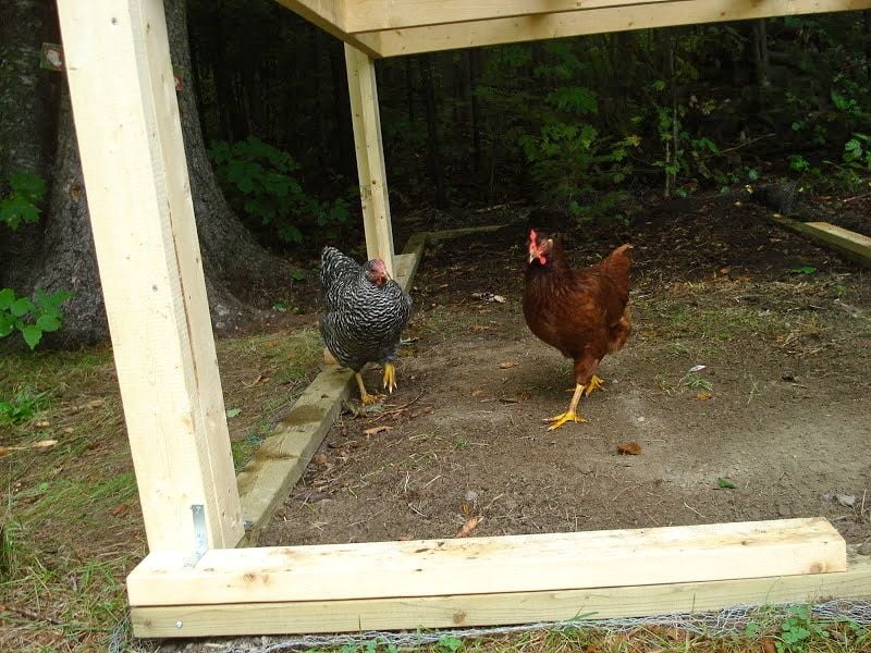 We used tin for the roof and have put rocks on top of chicken wire that was lain flat on the ground to keep predators from digging into the coop. You can see the rocks through the chicken wire on the left hand side of the coop.