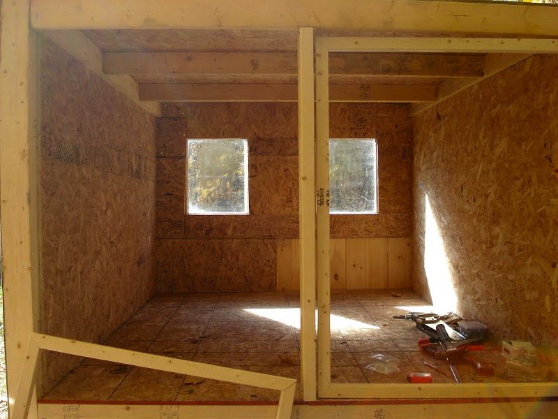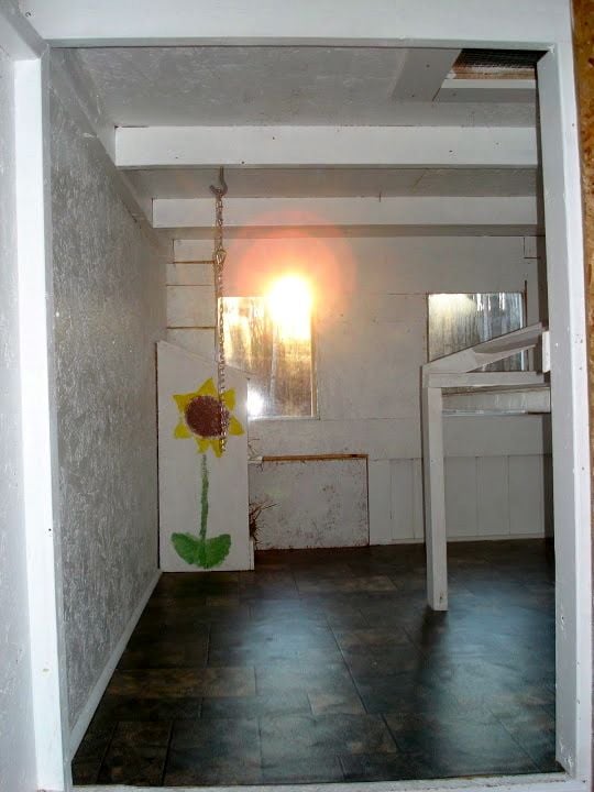We finished the floor with linoleum. The chain is to hang the feeder off of and, you can see on the roof, one of two 1ftx1ft ventilation holes.