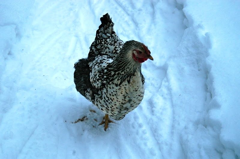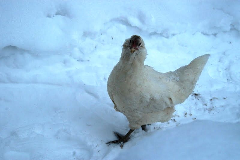 So, I set her up a house in the garage gave her food, water, yogurt, and warm baths.  A few days later, she went from being on the verge of  conking out to being outside with her friends healthy and happy :) But, this is not the end, a few days later Demeter started molting, losing her feathers and growing new ones.  Obviously Deme has to pick the middle of winter to molt :P