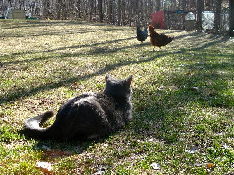 Our cat Figaro has learned not to hurt the chickens after he was chased by them when he got too close.